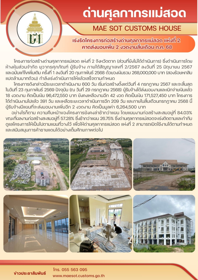 **เร่งรัดโครงการก่อสร้างด่านศุลกากรแม่สอด แห่งที่ 2 คาดส่งมอบเพิ่ม 2 งวดงาน สิ้นเดือน ก.ค. 68**