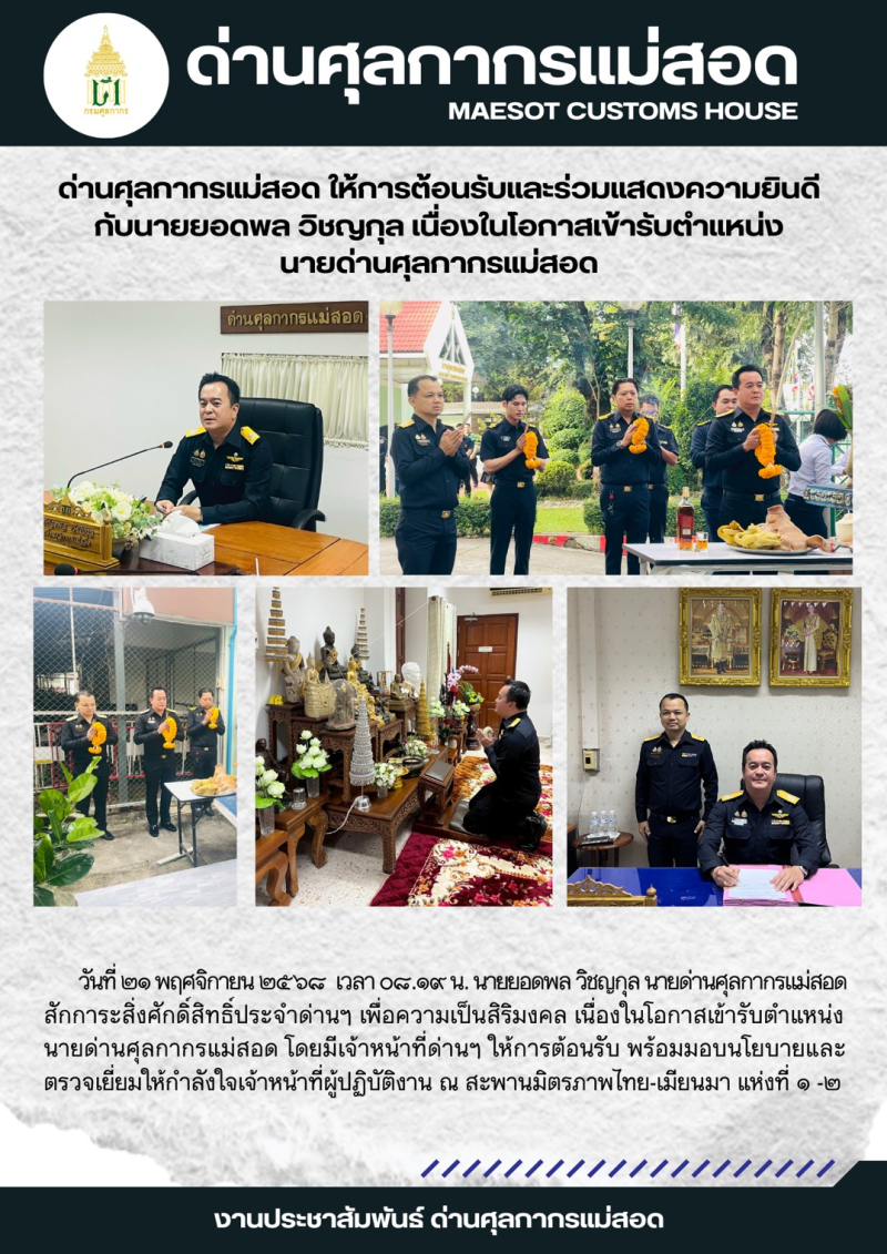 ด่านศุลกากรแม่สอดให้การต้อนรับและร่วมแสดงความยินดีกับนายยอดพล วิชญกุล เนื่องในโอกาสเข้ารับตำแหน่ง นายด่านศุลกากรแม่สอด