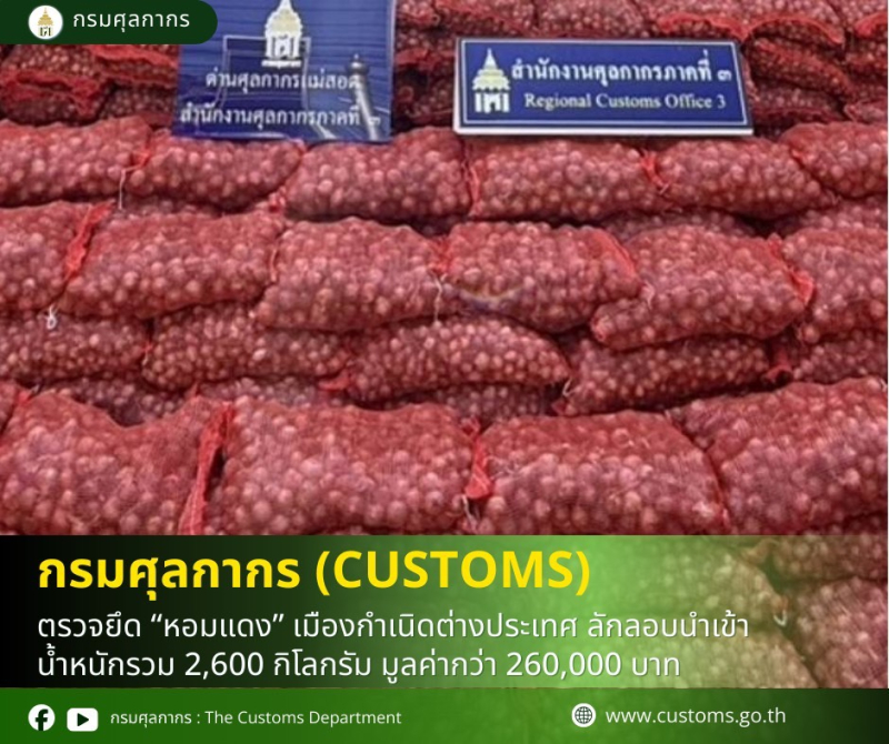 5 ธ.ค.2568 // ด่านศุลกากรแม่สอด ตรวจยึด หอมแดง เมืองกำเนิดต่างประเทศ ลักลอบนำเข้า น้ำหนักรวม 2,600 กิโลกรัม มูลค่ากว่า 260,000 บาท