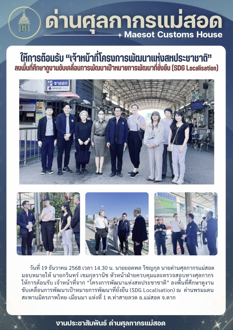 ด่านศุลกากรแม่สอดให้การต้อนรับ "เจ้าหน้าที่โครงการพัฒนาแห่งสหประชาชาติ" ลงพื้นที่ศึกษาดูงานขับเคลื่อนการพัฒนาเป้าหมายการพัฒนาที่ยั่งยืน (SDG Localisation)