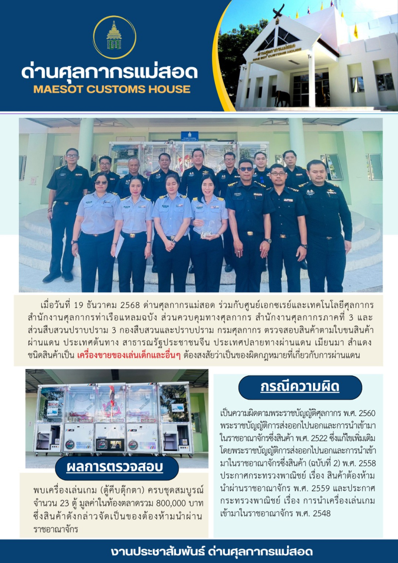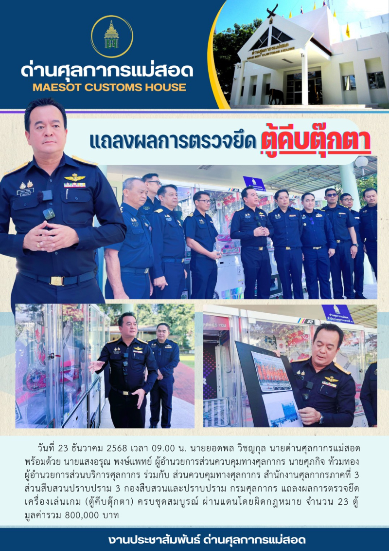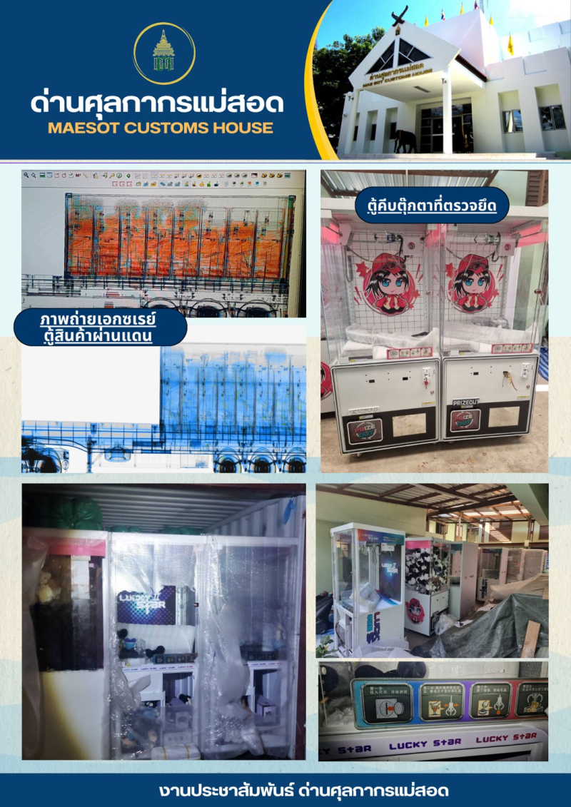 //++ด่านศุลกากรแม่สอด แถลงผลการตรวจยึดตู้คีบตุ๊กตาผ่านแดนโดยผิดกฎหมาย จำนวน 23 ตู้ มูลค่ารวม 800,000 บาท++//