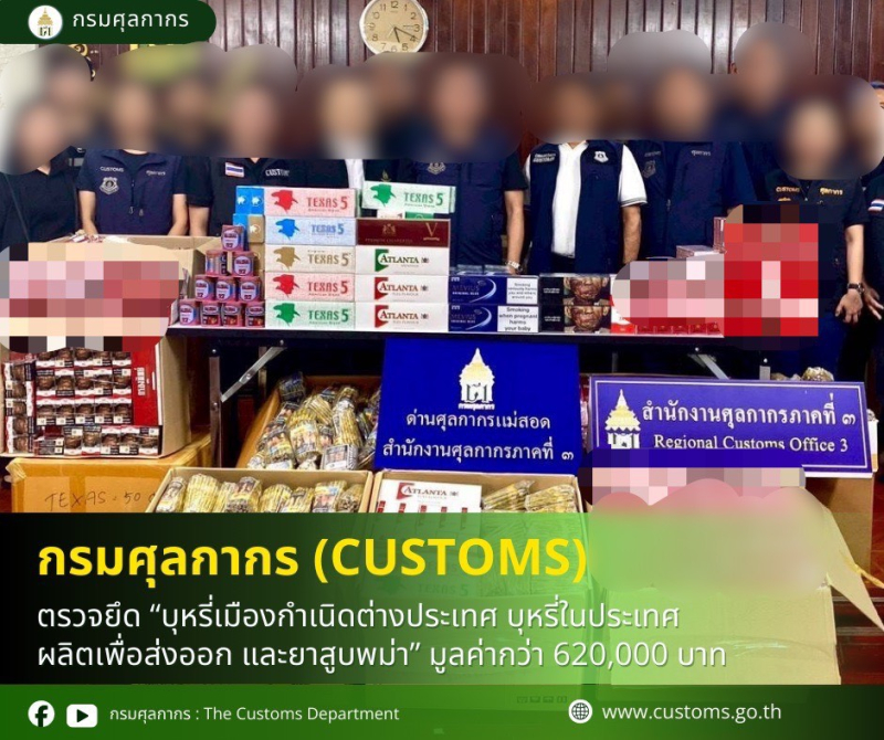ด่านศุลกากรแม่สอด ตรวจยึด บุหรี่เมืองกำเนิดต่างประเทศ บุหรี่ในประเทศผลิตเพื่อส่งออก และยาสูบพม่า มูลค่ากว่า 620,000 บาท