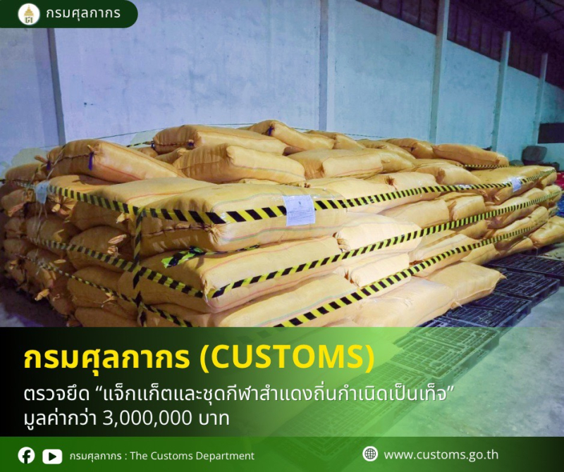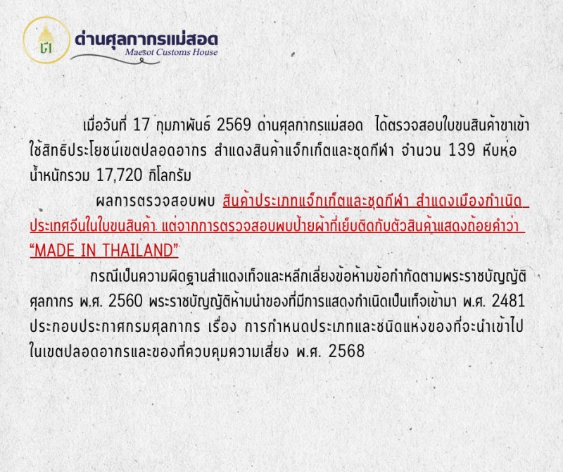 ด่านศุลกากรแม่สอด ตรวจยึด แจ๊กเก็ตและชุดกีฬาสำแดงถิ่นกำเนิดเป็นเท็จ มูลค่ากว่า 3,000,000 บาท