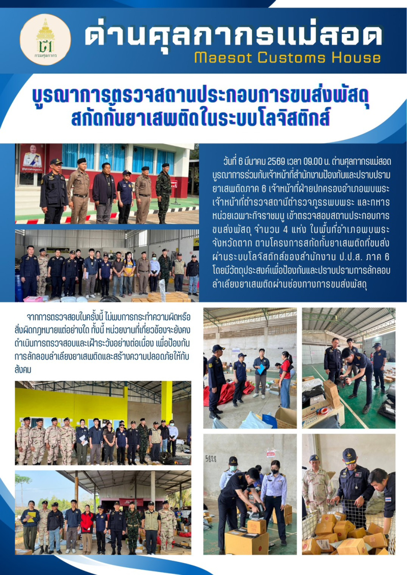ด่านศุลกากรแม่สอดบูรณาการตรวจสถานประกอบการขนส่งพัสดุสกัดกั้นยาเสพติดในระบบโลจิสติกส์