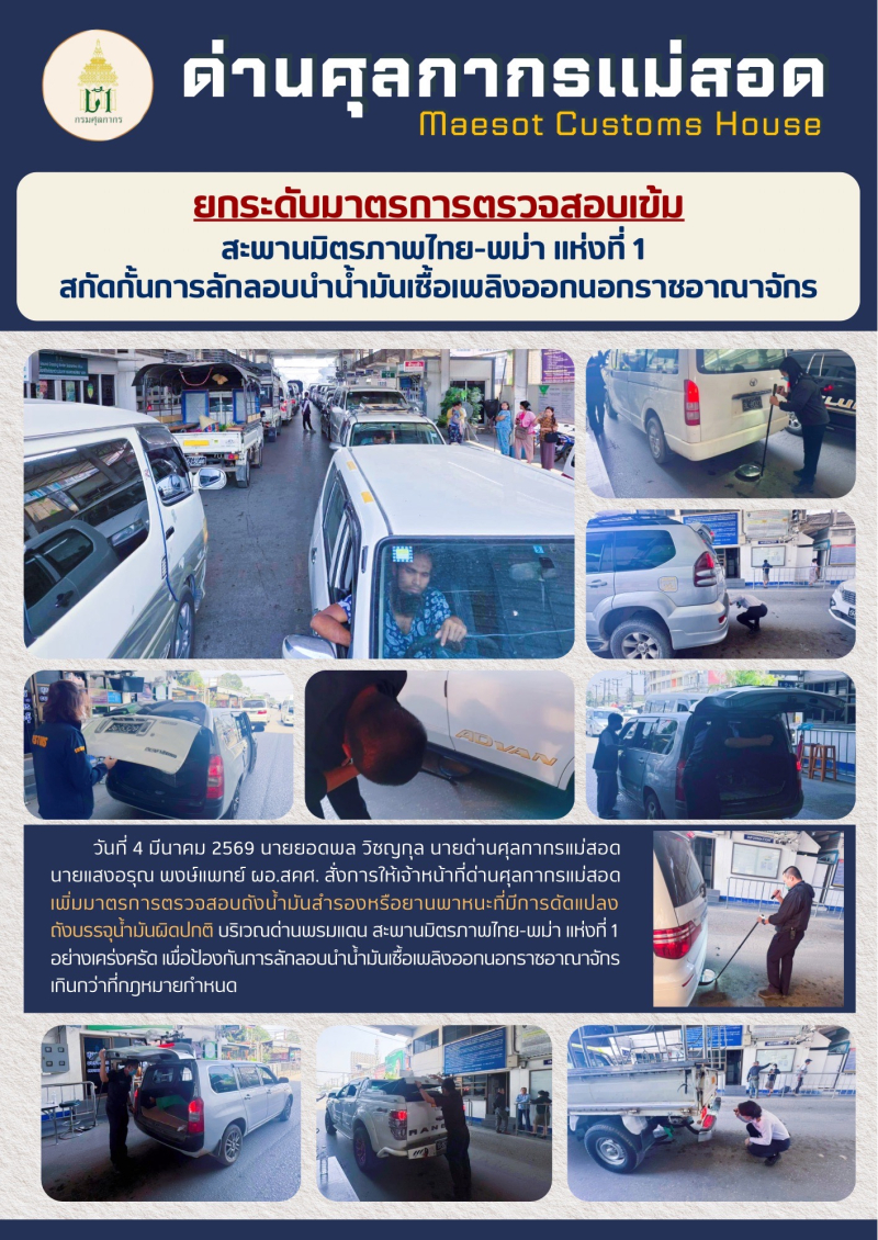 ด่านศุลกากรแม่สอดยกระดับมาตรการตรวจสอบเข้มสะพานมิตรภาพไทย-พม่า แห่งที่ 1 สกัดกั้นการลักลอบนำน้ำมันออกนอกราชอาณาจักร